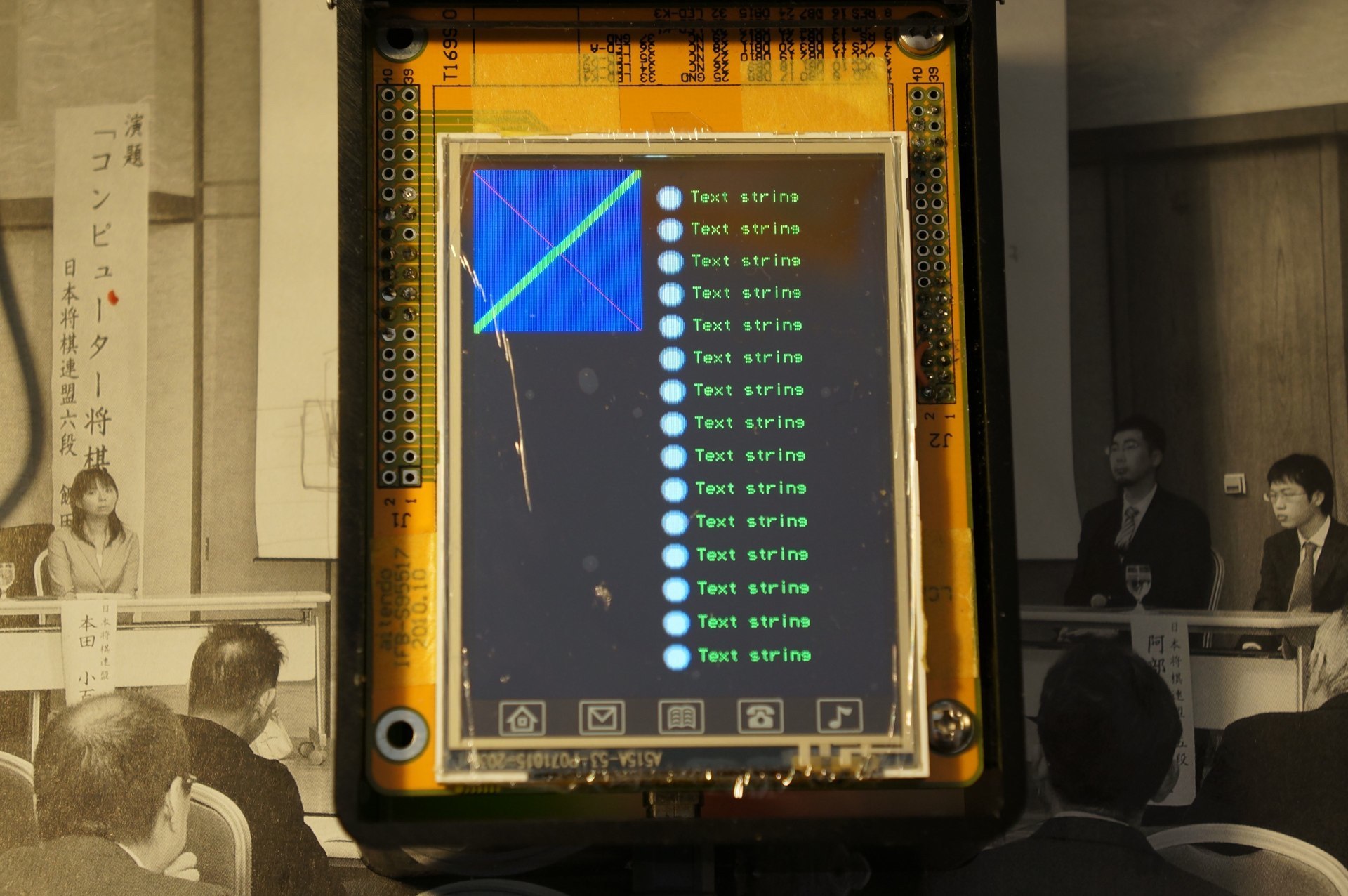 表示図形: 塗りつぶし矩形、任意角度・任意幅の直線、固定6サイズの文字、円弧