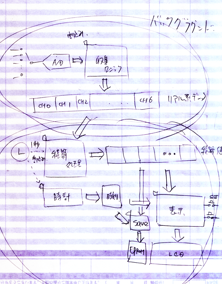 ・一つは割込処理で、バックグラウンドで動いている感じです。常時A/Dコンバータを駆動させるために、変換完了割込を利用し、無限にA/D変換を繰り返します。変換結果は、引き継ぎ用のメモリ領域にセットし、常に最新に更新します。同様に、時計もタイマの割込タイミングで年月日時分秒を更新します。(絵ではメイン処理に入っていますが、実際は割り込み処理内で行っています)